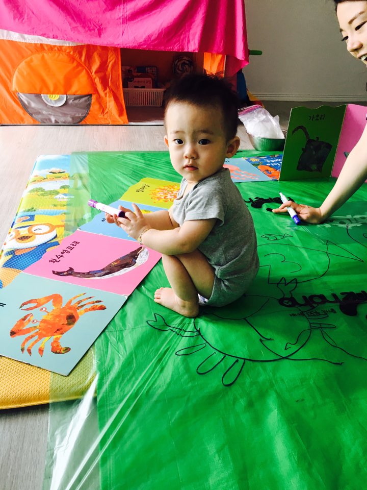 너무나 예쁘고 친절한 김지은 선생님을 만나 첫날부터 재미있게 노는 우리 아들. 사실 저희 아이는 겁도 많고 조심스러운 성격이라 처음 보는 선생님과 수업을 잘 할 수 있을까 걱정이 많았는데요, 차분한 선생님을 만나 첫날부터 재미나게 수업을 진행할 수 있었어요. 바스락 거리는 비닐도 만져보고 몰캉거리는 스폰지볼도 발가락에 끼우며 깔깔깔 놀다보니 30분이 눈깜짝할 사이에 흘러갔습니다. 그리고 대망의 두 번째 수업. 아이가 너무 좋아하다보니 아이보다 제가 더 히히호호 수업이 기다려지더라구요. 두 번째 수업은 본격적인 물감놀이었어요. 물감놀이에 앞서 선생님과 바다친구들을 만나 인사하고 마커펜으로 그림도 그려보았어요.