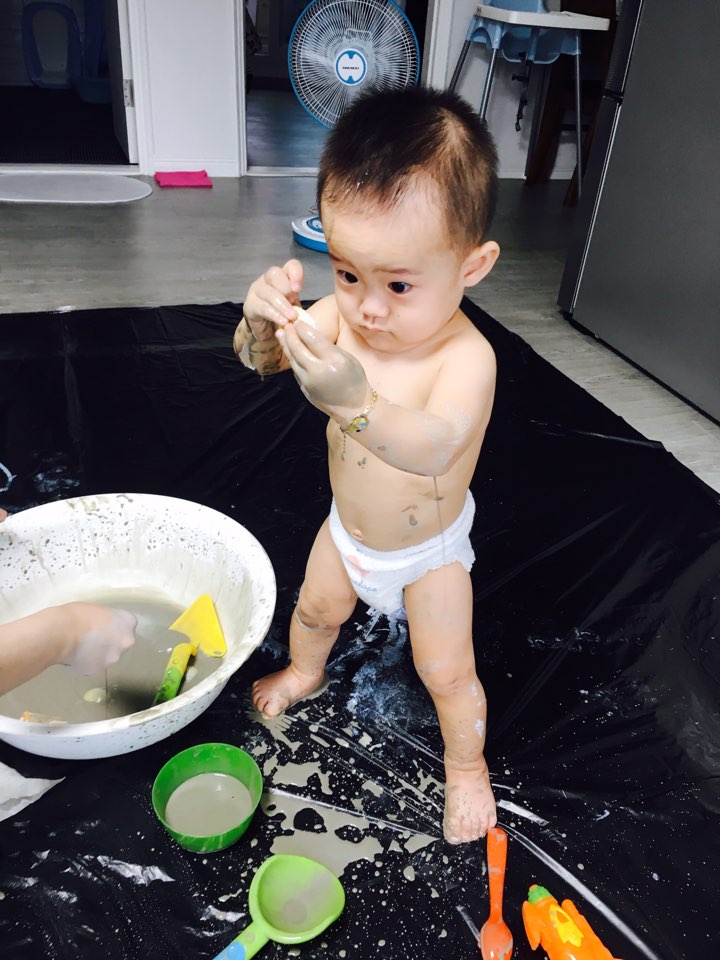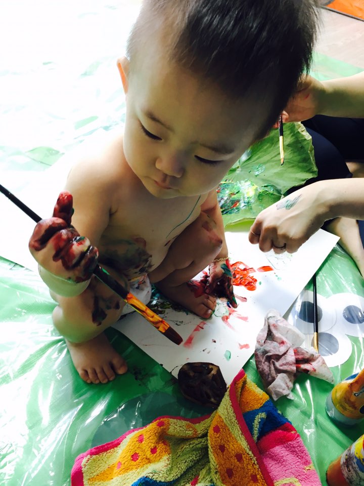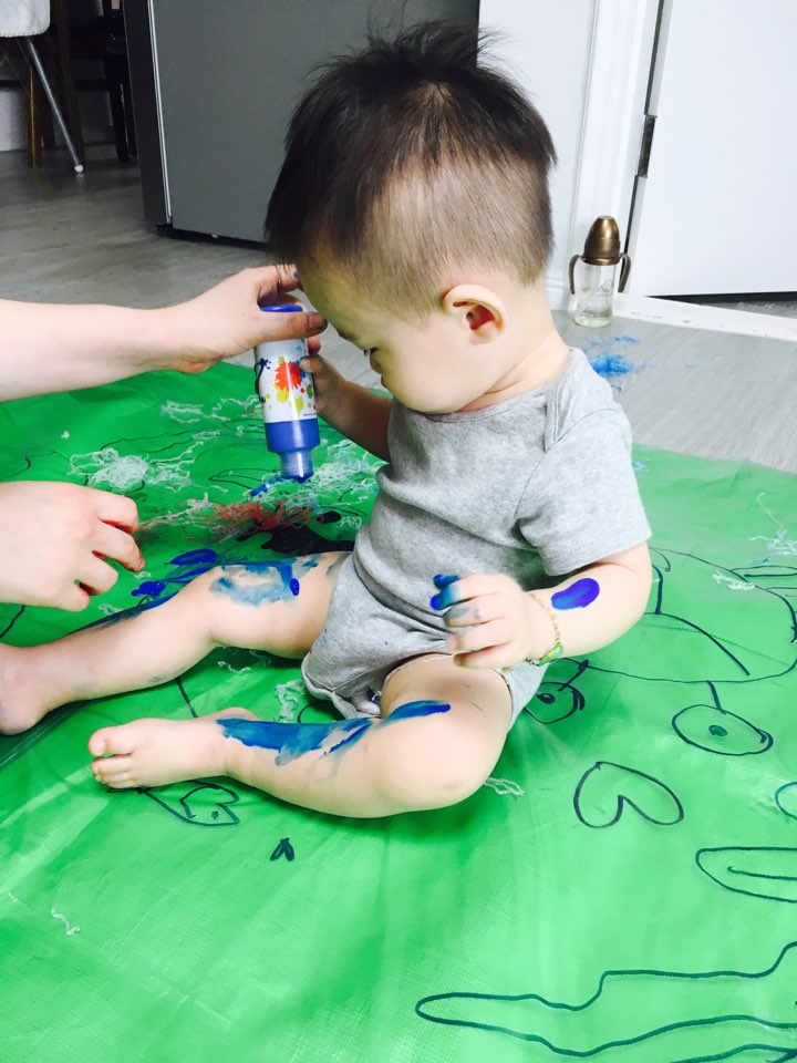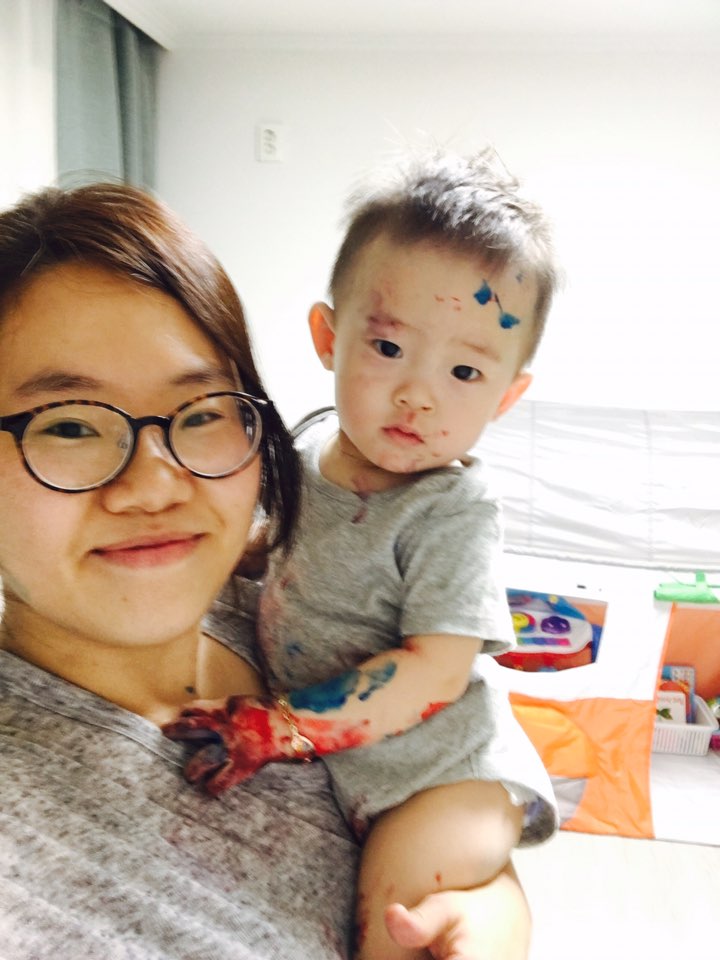 물감놀이를 참 좋아해서 이제 붓으로 물감을 콕 찍어 종이와 몸에 여기저기 그리는 꼬마 피카소이자,