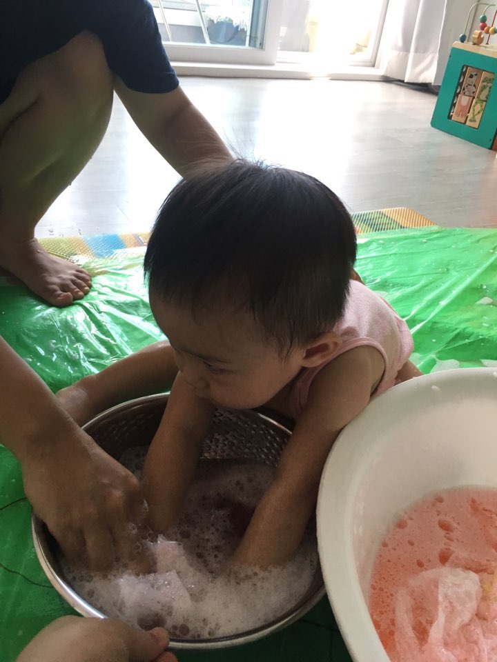 요렇게 얼룩이 덜룩이가 되었답니다. 선생님 말씀으로는 아이들이 처음엔 물감 만지기를 싫어한다던데, 저희 아이는 물감을 정말 너무나 좋아했어요. 만약 히히호호 수업이 아니었다면, 저는 아이와 물감으로 놀아볼 생각은 절대 못했을텐데, 히히호호 수업 덕분에 저희아이가 물감놀이를 좋아한다는 새로운 사실도 알게 되니 아이와 한층 가까워진 느낌이 들었어요. 알록달록 물감칠을 한 아이가 너무 예쁘고 기특해서 함께 기념샷도 찰칵, 찍었답니다. 7월 수업 중 압권은 버블물감으로 빨래 놀이를 체험하는 것이었어요.