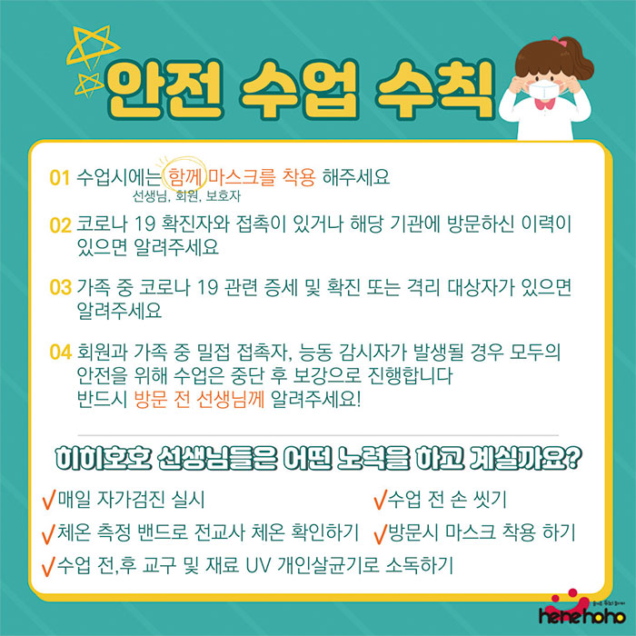 코로나 함께 극복해요. 히히호호 수업 전/후 안심 방역 수칙